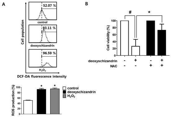 A disproportional increase in intracellular reactive oxygen species (ROS) can induce cancer cell cycle arrest, apoptosis, and cellular senescence [18]. Thus, we determined the effect of deoxyschizandrin on intracellular ROS levels in A2780 cells. As shown in Figure 4A, deoxyschizandrin considerably induced ROS production in A2780 cells. To further confirm the involvement of ROS in deoxyschizandrin-induced cell growth inhibition, an antioxidant N-acetyl-l-cystein (NAC) was used. NAC treatment significantly reversed deoxyschizandrin-induced decrease in A2780 cell growth (Figure 4B).