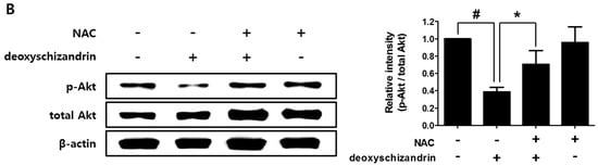 Involvement of Akt signalling in deoxyschizandrin-induced cell cycle arrest in A2780 cells: (A) A2780 cells were transfected with Akt expression vector and were treated with deoxyschizandrin (30 µM) for 48 h. MTT assay was performed to measure the cell viability in A2780 cells. The values represent the mean ± SD of results from three independent experiments. # p < 0.05 vs. the control group; * p < 0.05 vs. the treated group transfected with empty vector; (B) A2780 cells were treated with 5 mM of N-acetyl-l-cystein (NAC) and deoxyschizandrin (30 µM) for 8 h. Western blot analysis was performed to measure the phosphorylation of Akt in A2780 cells. β-Actin was used as an internal control. Band images are representatives of three individual experiments and the results of densitometry represent the mean ± SD of three independent experiments. # p < 0.05 vs. the control group; * p < 0.05 vs. the treated group.