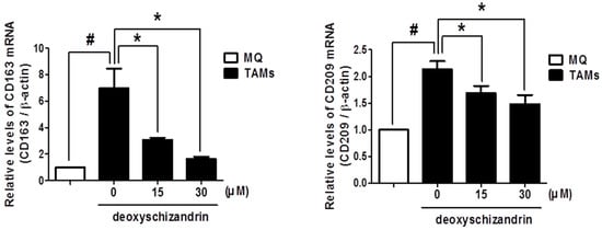 Emerging evidence demonstrates that TAMs play an important role in cancer progression. Interestingly, TAMs have been shown to display typical M2 macrophage phenotypes [20]. We examined the effect of deoxyschizandrin on the expression of the M2 phenotype markers CD163 and CD209 in TAMs [14,21]. TAMs, macrophages stimulated by the conditioned medium of A2780 cells, were found to have higher levels of M2 phenotype markers CD163 and CD209 than control macrophages (MQ), and deoxyschizandrin significantly suppressed CD163 and CD209 expression in TAMs (Figure 6).