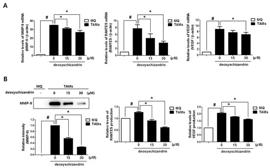 Previous research has demonstrated that TAMs can promote tumour growth, metastasis, and angiogenesis by secreting of various mediators [13]. We established that the protumoural factors MMP-9, RANTES, and VEGF are highly expressed in TAMs, compared to their expression in control macrophages (MQ) (Figure 7). Deoxyschizandrin treatment significantly suppressed the mRNA and production levels of MMP-9, RANTES, and VEGF expression in TAMs. These data suggest that deoxyschizandrin can reduce the pro-tumour activities of TAMs in tumour microenvironment by suppressing pro-tumour mediator production as well as M2 polarization.