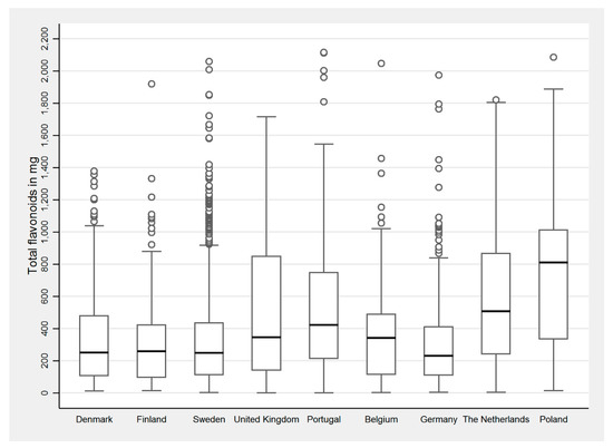 The distribution of total flavonoid intake is shown in Figure 1, and that of other subclasses in Table 2. Overall, the median intake of total flavonoids was 291 mg/person/day. Germany and Belgium had the lowest intake. Poland, the Netherlands, and Portugal had the highest intakes of total flavonoids. The Scandinavian countries and the UK had an intermediate intake. The main contributors to total flavonoid intake are summarised in Table 3. Fruits were the main source, followed by tea, wine, chocolate, and vegetables. As expected, flavonoid polymers were the main source of flavonoids in most food groups. Citrus fruits were the predominant source of flavonones. Fruits (mostly berries and citrus) and wine were the main contributors of anthocyanins, whilst flavonols and flavones were mainly derived from vegetables (Table 3).