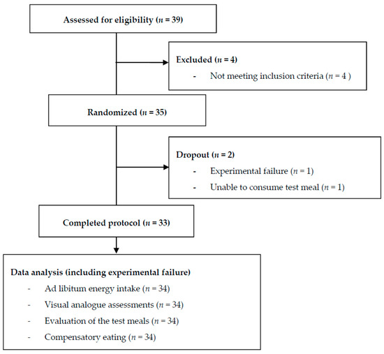 One participant dropped out on the first experimental day, as he was unable to consume the test meal. Another participant received the same test meal twice due to an experimental error. Thus, 33 participants received all four test meals (Figure 1).
