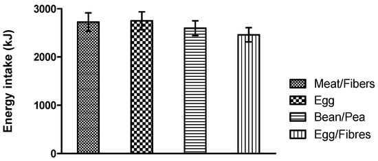 The completion rate of the food records was 99.2% (134 of 135 potential records were received). No differences were found in energy intake across test meals during the rest of the test day (meat/fiber: 6331 ± 604 kJ (1512 ± 144 kcal); egg: 6009 ± 550 kJ (1435 ± 131 kcal); bean/pea: 6005 ± 567 kJ (1435 ± 135 kcal); and egg/fiber: 5806 ± 619 kJ (1387 ± 148 kcal), (p > 0.05).