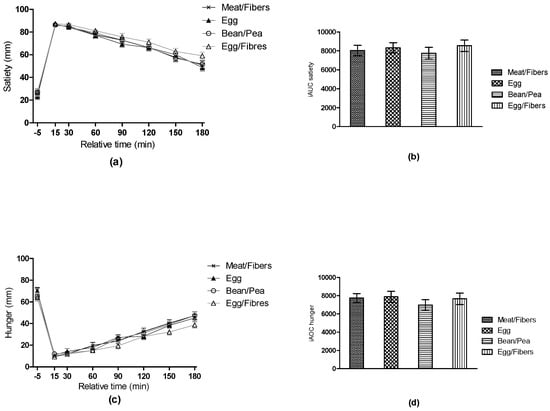 Mean unadjusted three-hour changes in (a) satiety, (c) hunger, and (b) corresponding incremental area under the curve (iAUC) and (d) incremental area over the curve (iAOC), respectively. Data are presented as mean ± SEM. Both as repeated measures, analyzed using mixed linear models including a time * meal interaction, and iAUC or iAOC, analyzed using mixed linear models including meal as a fixed effect. No differences were found in satiety and hunger across meals (all p > 0.05).