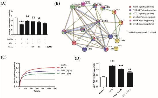 The effects of chlorogenic acid (CGA) on the regulation of glucose consumption and the prediction of its target proteins. (A) Effects of different concentrations of CGA on glucose consumption in insulin-treated HepG2 cells. Metformin hydrochloride (Met) served as a positive control. Each bar represents the mean ± standard error of the mean (SEM). +: with; -: without. *** p < 0.001 vs. control; # p < 0.05 vs. model; ## p < 0.01 vs. model (n = 6). (B) Prediction of the targets of CGA using PharmMapper and analysis of the interaction and signaling on potential target proteins using String v9.1. (C) The enzymatic activity of protein kinase B (AKT) in HepG2 cells after treatment with different concentrations of CGA. SC79 was used as a positive control. (D) The histogram presents the activities of AKT at 600 s after the respective treatments. Each bar represents the mean ± SEM. ** p < 0.01 vs. control; *** p < 0.001 vs. control (n = 3).