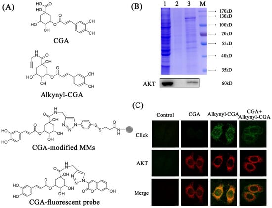 The chemical structures of the compounds used and results of target fishing. (A) The chemical structures of CGA, alkynyl-CGA, CGA-modified magnetic microspheres (MMs), and the CGA-fluorescent probe. (B) SDS-PAGE (upper panel) and Western blot analysis (lower panel) were used to detect proteins enriched by CGA-modified MMs in HepG2 cells. Lane 1: total protein content of the HepG2 cell lysate. Lane 2: the protein enriched from HepG2 cell lysate by azide-modified MMs. Lane 3: the protein enriched from HepG2 cell lysate by CGA-modified MMs. M: marker. (C) Co-localization of the CGA-fluorescent probe (green) and AKT antibody (red) in HepG2 cells (magnification 200×).