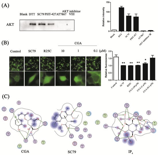 To clarify the details of the binding pocket of AKT with CGA, a set of AKT ligands was chosen to compete with CGA-modified MMs in capturing AKT. SC79 and PHT-427 are reported to be a selective stimulator and an inhibitor of AKT, respectively, which combine with the AKT PH domain [26,27]. AT7867 is an inhibitor of AKT which binds at the ATP binding pocket of AKT [28]. AKT inhibitor VIII is an allosteric inhibitor of AKT [29]. As shown in Figure 3A, compared with the DTT group, the bands of AKT in the SC79 and PHT-427 groups were clearly detected by Western blot, while no band was seen in the AT7867 or AKT inhibitor VIII groups. This result indicates that CGA might combine with the AKT PH domain in a similar manner to SC79 and PHT-427.