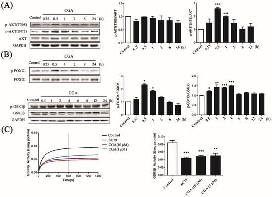 The effects of CGA on AKT phosphorylation and its downstream factors. (A) The time-dependent effect of CGA on the phosphorylation of AKT (T308 and S473). (B) The time-dependent effect of CGA on the phosphorylation of forkhead box O1 (FOXO1) and glycogen synthase kinase 3β (GSK3β). The histograms present the relative intensities of the detected protein bands. (C) The effect of CGA on the enzymatic activity of GSK3β. SC79 was used as the positive control. The histogram presents the activity of GSK3β at 600 s after the respective treatments. Each bar represents the mean ± SEM. * p < 0.05 vs. control; ** p < 0.01 vs. control; *** p < 0.001 vs. control (n = 3).