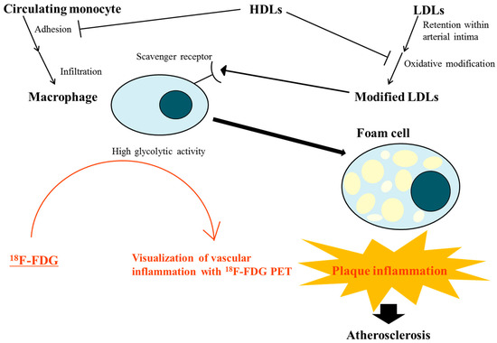 Interplay of lipoproteins and macrophages linked to plaque inflammation during atherosclerotic process and evaluation of this vascular inflammation by 18F-fluorodeoxyglucose (FDG) positron emission tomography (PET). Modified low-density lipoproteins (LDLs) trigger plaque inflammation by interacting with macrophages. The macrophages ingest modified LDL through scavenger receptors and evolve into foam cells, which play a key role in the development and progression of atherosclerosis. High-density lipoproteins (HDLs) protect LDLs from oxidative modification and inhibit monocyte adhesion to the endothelium by decreasing the expression of adhesion molecules in endothelial cells. Loss of this protective function of HDL in dyslipidemic states may accelerate plaque inflammation, amplifying the role of modified LDLs. The high glycolytic activity of infiltrated macrophages enables visualization of vascular inflammation in atherosclerotic lesions by 18F-FDG PET.