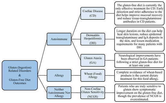 CD, DH, and GA are gluten-related autoimmune conditions [141]. CD is a chronic enteropathy involving a gliadin-specific T-cell response, causing inflammation, villous atrophy, and malabsorption in the small bowel of genetically vulnerable individuals [141,145]. In fact, an association between CD and other gastrointestinal and extraintestinal disorders was reported. DH is a common comorbidity of CD and is often called “coeliac disease of the skin” [141,145,146]. It presents as an itchy, blistering rash and is detected by the existence of IgA epidermal transglutaminase antibody complexes in the papillary dermis [147]. Finally, GA is a condition in which cerebellar damage results from the production of antibodies, following gluten ingestion by susceptible patients [141]. NCGS, on the other hand, is diagnosed by exclusion criteria; when a reaction to gluten is evident after both a wheat allergy and CD have been ruled out [142,143]. A significant proportion of patients with IBS have a sensitivity to gluten [148]. Literature indicates that similarities in the clinical presentation of NCGS and IBS generate confusion when evaluating the causes and management options for the manifested symptoms [142,149,150].