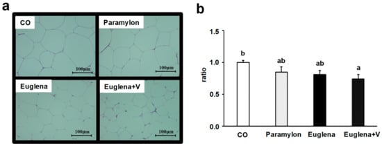Effects of intake of Euglena and vegetables on white adipose tissue in mice. (a) Epididymal adipose tissue sections from representative mice in each group (hematoxylin & eosin, scale bar = 100 µm). (b) Adipocyte size ratio values are presented as the mean ± standard error of the mean, n = 10. Different superscript letters indicate significantly different means at p < 0.05 (refer to “Result” in detail). CO, control diet group; Paramylon, the group that received the normal diet containing 0.3% paramylon; Euglena, the group that received the normal diet containing 1.0% Euglena; Euglena + V, the group that received the normal diet containing 1.0% Euglena and 0.3% vegetables.