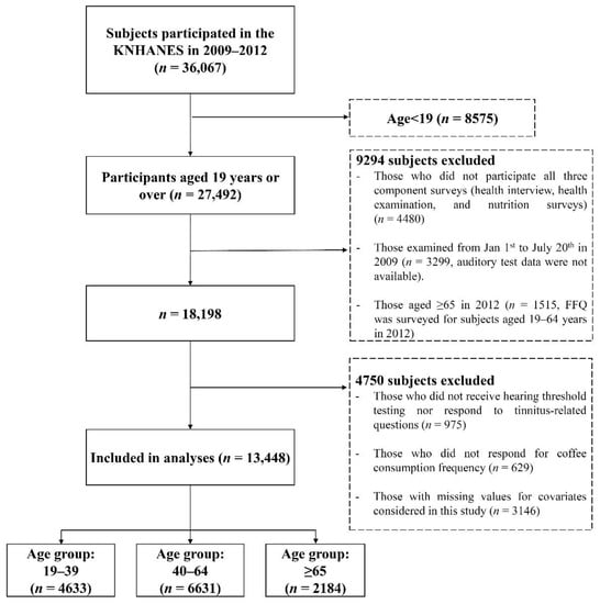 In total, 36,067 individuals participated in the 2009–2012 KNHANES. Individuals with ear disease (external ear problem, middle ear problem, inner ear problem, retrocochlear problem, congenital hearing loss and systemic disease) were not included here. Of them, 27,492 participants were age ≥19 years. Among 27,492 participants aged ≥19, 9294 participants were excluded because they did not complete all three component surveys (health interview, health examination, and nutrition surveys) (n = 4480) or examined from January 1 to July 20 in 2009 (n = 3299, auditory test data were not available) or aged ≥ 65 in 2012 (n = 1515, FFQ was surveyed for subjects aged 19–64 years in 2012). Of the remaining 18,198 subjects, additional 4750 were excluded because they did not receive hearing threshold testing nor respond to tinnitus-related questions (n = 975) or did not respond for coffee consumption frequency (n = 629) or have missing values for covariates considered in this study (n = 3146). Finally, 13,448 subjects (4633 subjects aged 19–39, 6631 aged 19–39 and 2184 aged ≥65 years) were included in the analysis for the present study (Figure 1). This study was approved by the Institutional Review Board of the Seoul National University Hospital (IRB number: E-1808-064-965).