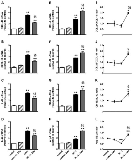 Dietary supplementation with fatty acids (FAs) reduces upregulated levels of M1-related markers including C-X-C motif chemokine (CXCL)-10 (in A), CXCL-11 (in B), interleukin (IL)-12 (in C), and IL-23 (in D), while additionally increases upregulated levels of M2-related markers including C-C motif chemokine (CCL)-2 (in E), CCL-22 (in F), cluster of differentiation-163 (CD-163, in G), and arginase-1 (Arg-1, in H). Transcript levels were evaluated in retinal homogenates from control and oligodendrocyte glycoprotein (MOG)-treated mice, without or with FAs supplementation by relative quantification with quantitative real-time PCR (qPCR). Data were analyzed by the formula 2−ΔΔCT using ribosomal protein L13A (Rpl13a) as the internal standard. Ratio of the mean values of CCL-2 to CXCL-10 (I); CCL-22 to CXCL-11 (J); CD-163 to IL-12 (K); and Arg-1 to IL-23 (L). Data are shown as the mean ± S.E.M. (n = 9 for each experimental group). * p < 0.01; ** p < 0.001 versus control. § p < 0.01; §§ p < 0.001 versus MOG (One way ANOVA followed by the Newman–Keuls multiple comparison post-hoc test). White bars, control mice; dashed bars, control mice with FAs supplementation; black bars, MOG-treated mice; grey bars, MOG-treated mice with FAs supplementation.