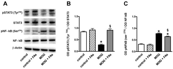 Dietary supplementation with FAs prevents MOG-induced downregulation of signal transducer and activator of transcription 3 (STAT3) phosphorylation and reduces upregulated levels of phosphorylated nuclear factor kappa-light-chain-enhancer of activated B cells (NF-κB). (A) Representative blots from retinal homogenates of control and MOG-treated mice, with or without FAs supplementation. Protein levels of pSTAT3 (Tyr205) (B) and pNF-κB (Ser276) (C) were evaluated by Western blot using STAT3 or NF-κB as loading controls. Data from densitometric analysis are shown as the mean ± S.E.M. (n = 9 for each experimental group). * p < 0.001 versus control. § p < 0.001 versus MOG (One way ANOVA followed by the Newman–Keuls multiple comparison post-hoc test). White bars, control mice; dashed bars, control mice with FAs supplementation; black bars, MOG-treated mice; grey bars, MOG-treated mice with FAs supplementation.