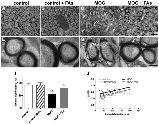 Dietary supplementation with FAs counteracts MOG-induced optic nerve demyelination. Representative electron micrographs of the optic nerves in control mice without (A) or with (B) FAs supplementation, MOG-treated mice (C), and MOG-treated mice with FAs supplementation (D). Calibration bar 2 µm. Higher-magnification micrographs are shown in (E) (control mice), (F) (control mice with FAs supplementation), (G) (MOG-treated mice), and (H) (MOG-treated mice with FAs supplementation). Calibration bar, 200 nm. (I) Quantification of myelinated axons. Data are shown as the mean ± S.E.M. (n = 5 for each experimental group) * p < 0.001 versus control, § p < 0.01 versus MOG (One way ANOVA followed by the Newman–Keuls multiple comparison post-hoc test). White bars, control mice; black bars, MOG-treated mice; grey bars, MOG-treated mice with FAs supplementation. (J) Analysis of mean g-ratio, the ratio of the inner axonal diameter to the total outer diameter (two-way ANOVA followed by Bonferroni’s multiple comparison post-test).