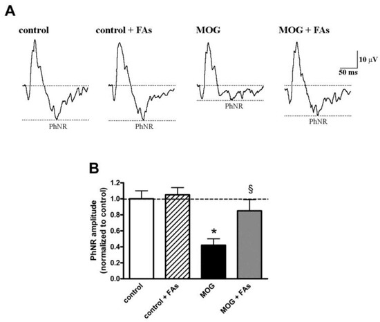 Dietary supplementation with FAs almost prevents MOG-induced reduction of photopic negative response (PhNR) amplitude. (A) Representative recordings in control and MOG-treated mice with or without FAs supplementation. (B) PhNR amplitudes were normalized to the amplitude of the control group. Data are shown as the mean ± S.E.M. (n = 6 for each experimental group). * p < 0.001 versus control. § p < 0.001 versus MOG (One way ANOVA followed by the Newman–Keuls multiple comparison post-hoc test). White bars, control mice; dashed bars, control mice with FAs supplementation; black bars, MOG-treated mice; grey bars, MOG-treated mice with FAs supplementation.