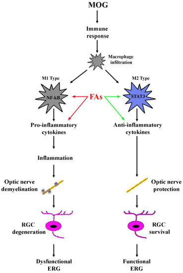 Schematic diagram depicting the role of FAs in the EAE model. MOG induces an immune response resulting in macrophage infiltration. Infiltrating macrophages can acquire distinct phenotypes M1 or M2, of which, M1 produces pro-inflammatory cytokines and activates inflammatory processes, while M2 plays a role in the blockade of inflammation and promotes tissue repair. Both FAs-induced inhibition of M1 phenotype (red arrows) and FAs-induced activation of M2 phenotype (green arrows) concur to prevent inflammatory processes in the retina thus hampering optic nerve damage and retinal ganglion cell (RGC) death, events that both participate to counteract electroretinogram (ERG) dysfunction.