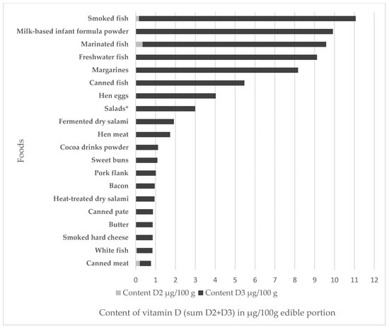 Figure 1 shows 20 groups of foods (TDS pooled samples) with the highest average content of vitamin D (sum of D2 + D3) in 100 g of edible portions. The highest contents of vitamin D (sum of D2 + D3) were measured in fish and fish products (smoked, marinated, freshwater, canned fish) at 5.45–11.11 μg/100 g, in milk-based infant formula powder at 9.92 μg/100 g, in margarines (which are fortified foods) at 8.17 μg/100, in hen eggs at 4.03 μg/100 g, in salads (composed of 50% fish salad) at 2.99 μg/100 g, in fermented dry salami at 1.93 μg/100 g, and in hen meat at 1.73 μg/100 g.