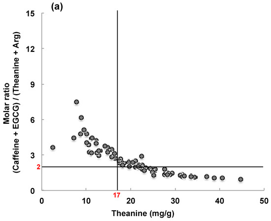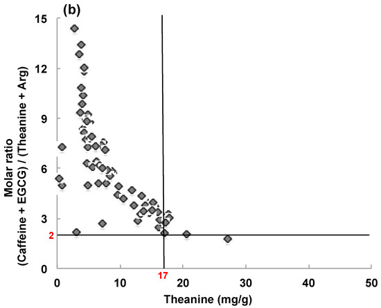 The amount of theanine and the molar ratio of caffeine and EGCG to theanine and Arg in (a) 76 samples of matcha marketed in Japan and (b) 67 samples of matcha marketed overseas. Based on data in humans, samples in the section, theanine > 17 mg/g, and molar ratio of caffeine and EGCG to theanine and Arg < 2 are expected to show a stress-reducing effect.