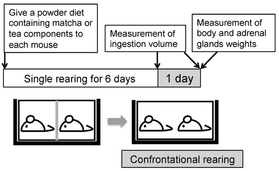 Male ddY mice (Slc: ddY, four weeks old) were purchased from Japan SLC Co. Ltd. (Shizuoka, Japan) and kept under conventional conditions in a temperature- and humidity-controlled environment with a 12/12 h light/dark cycle (light period, 8:00 a.m.–8:00 p.m.; temperature, 23 ± 1 °C; relative humidity, 55 ± 5%). Four-week-old mice were reared in a group of six in a cage for five days to allow them to adapt to co-habitation. Mice were fed a normal diet (CE-2; Clea Co. Ltd., Tokyo, Japan) and water ad libitum. All experimental protocols were approved by the University of Shizuoka Laboratory Animal Care Advisory Committee (approval no. 166197) and were in accordance with the guidelines of the U.S. National Institute of Health for the Care and Use of Laboratory Animals. To apply psychosocial stress to mice, confrontational rearing was performed in a standard polycarbonate cage that was divided into two identical subunits by a stainless-steel partition as previously described [14]. In brief, two mice were reared in a partitioned cage for one week (single rearing) to establish territorial consciousness. Then, the partition was removed to expose the mice to confrontational stress for 24 h (confrontational rearing). Adrenal glands, a critical stress-responsible organ, became significantly enlarged after confrontational rearing and peak size was reached at 24 h. The phenomenon continues for at least one week [14]. In mice under confrontational rearing, adrenal-hypertrophy, change in diurnal rhythm of corticosterone, and depression-like behavior have been observed. In addition, adrenal hypertrophy was suppressed by the intake of the antidepressant and anxiolytic drug, diazepam [14]. Since the suppression of adrenal hypertrophy is thought to be related to antidepressant and anxiolytic effects, the stress-reducing and anxiolytic effects of matcha in mice was evaluated by weighing the adrenal glands. Each cage was placed in a styrofoam box (width 30 cm, length 40 cm, height 15 cm) to avoid visual social contact between cages.
