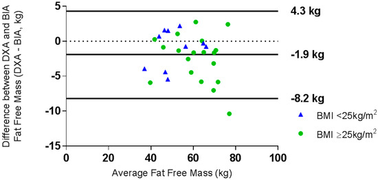 Bland-Altman plot of the difference between fat-free mass (kg), as measured by DXA and BIA, against the mean fat-free mass (kg) for the whole group. ● BMI ≥ 25 kg/m2, ▲ BMI < 25 kg/m2.
