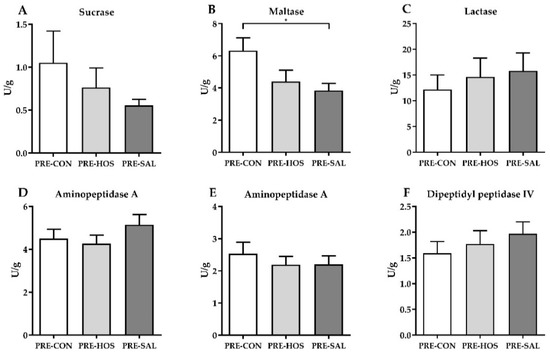 No differences were observed among the preterm groups for villus and crypt lengths as well as villus–crypt ratios, and the goblet cell density was similar between the three groups (Figure S2, Supplementary Materials). The increment in plasma galactose after an oral lactose bolus given on days 10 and 19 did not differ between the three preterm groups (61 ± 60 µmol/L and 101 ± 164 µmol/L, respectively, across groups). Similarly, the intestinal permeability measured by the lactulose-to-mannitol ratio on day 19 was equal among the groups (0.50 ± 0.56 across groups), as well as the activity of the six different brush border enzymes in the proximal and distal part of the small intestine. In the middle part of the small intestine, PRE-SAL had decreased maltase activity relative to PRE-CON (p < 0.05, Figure 2).