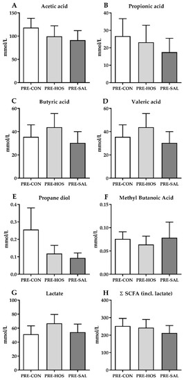 The levels of the microbial metabolites, acetic acid, butyric acid, propionic acid, valeric acid, propanediol, methyl butanoic acid and lactate were all similar between PRE-CON, PRE-HOS and PRE-SAL (Figure 4).