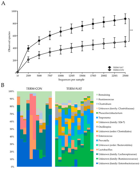 The number of observed species was higher in TERM-NAT (p = 0.001, Figure 6A) compared to TERM-CON, and they were dominated by Firmicutes (mainly members of the Ruminococcaceae family), Bacteroidetes (mainly represented by the Bacteroides and Prevotella genera) and the phylum Spirochaetes (<5%) (Figure 6B), whereas TERM-CON pigs were distributed similarly to the preterm pigs in Experiment 1, raised in the same artificial environment. The colonic microbiota composition of TERM-NAT was different from that of TERM-CON, as determined by both weighted as well as unweighted UniFrac distance dissimilarity metrics (p < 0.001, results not shown). Lactate levels were higher in TERM-CON (849% higher, p < 0.01), but levels of the other microbial metabolites measured, except for propanediol, were lower relative to TERM-NAT pigs (52–98% lower, p < 0.01, Table S4, Supplementary Materials). The total amount of microbial metabolites measured tended to be lower in TERM-CON relative to in TERM-NAT (p = 0.053, Table S4, Supplementary Materials).