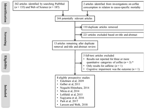 The PRISMA guidelines were followed for this meta-analysis. We searched PubMed from 1 January 1966 through 4 October 2018, using the search terms “coffee” (All Fields) and “dementia” (All Fields) or “coffee” (All Fields) and “Alzheimer’s disease” (All Fields). Moreover, Web of Science was searched from 1 January 1945 through 4 October 2018 using the search query “TOPIC: (coffee) and TOPIC: (dementia) or TOPIC: (coffee) and TOPIC: (Alzheimer’s disease)”. We searched for additional studies by scrutinizing the reference lists of relevant articles. Two researchers (S.C.L. and N.O.) independently reviewed the literature. A summary of the literature search, screening and study selection is presented in Figure 1.