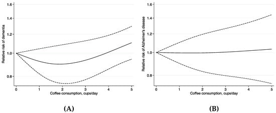 Dose-response association of coffee consumption with risk of dementia (A) and Alzheimer’s disease (B). The analyses of dementia and Alzheimer’s disease include eight and five prospective studies, respectively.