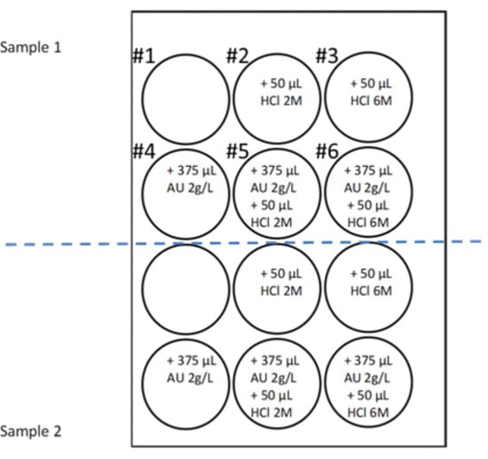 Uric acid crystallization (UAC) test. Six wells of a 12-well plate were used for each sample of urine, with each well containing 5 mL of urine and different amounts of HCL and uric acid. Well #1 had urine alone, well #2 had urine and 50 μL of 2 M HCl (0.1 mmoL H+), well #3 had urine and 50 μL of 6 M HCl (0.3 mmol H+), well #4 had urine and 750 µg uric acid (375 µL of 2 g/L solution), well #5 had urine, 50 μL of 2 M HCl and 750 µg uric acid, and well #6 had urine, 50 mL 6 M HCl and 750 µg uric acid. Uric acid (AU). + means addition of the specified volume of the solution.