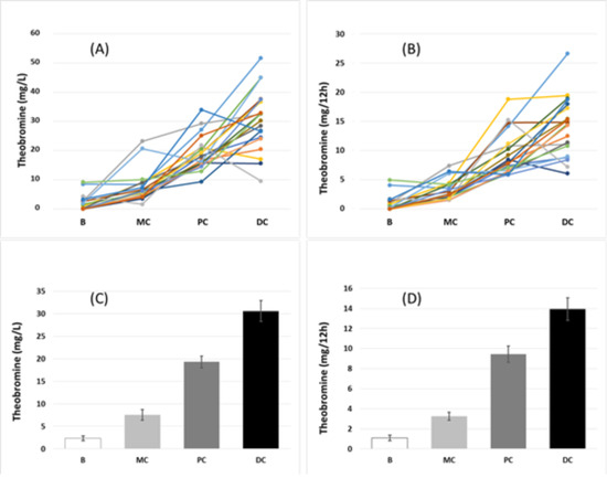 Figure 2A shows the urinary concentration of theobromine and Figure 2B shows the total theobromine excretion in 12 h in each of the 20 volunteers. Pooling these data (Figure 2C,D) indicated that the mean urinary concentration of theobromine and total theobromine excretion in 12 h was significantly greater after consumption of each cocoa-derived product than at baseline (p < 0.05 for each comparison).