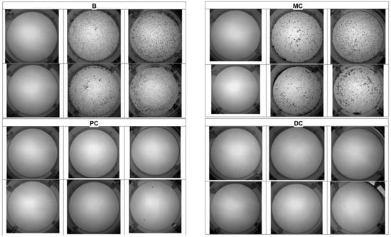 Representative UAC test results of one volunteer at baseline (B) and after consumption of milk chocolate (MC), chocolate powder (PC), and dark chocolate (DC). Uric acid crystallization was greatly reduced following consumption of chocolate powder or dark chocolate.