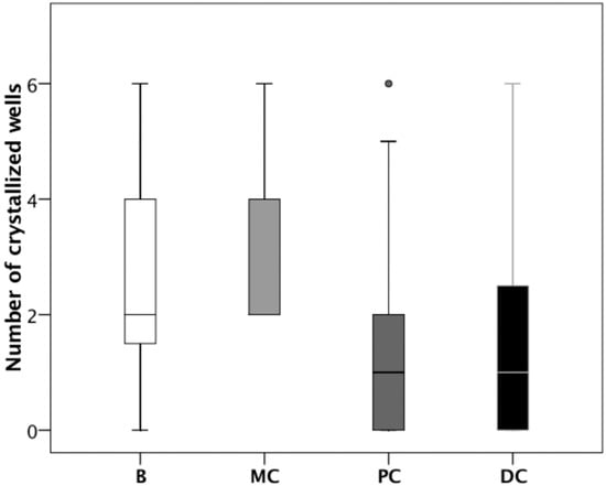 We used the UAC test to examine urine samples at baseline and after consumption of the different cocoa-derived products. Figure 3 shows the results of one representative individual. This individual had markedly reduced crystallization following the consumption of chocolate powder (PC), and dark chocolate (DC). The results for all 20 patients show that the UAC was significantly lower following the consumption of chocolate powder (PC) or dark chocolate (DC) relative to baseline (B), or following consumption of milk chocolate (MC). In Figure 4, p < 0.05 for each comparison).