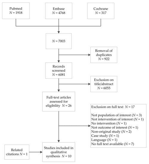 Our search yielded 6081 unique citations (Figure 1). Screening of title, abstract, full-text, and related citations provided ten articles suited to address our research question, including one article found via reference checking.