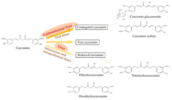 The metabolism of curcumin is critical for its potent biological activities as well as the beneficial effects on health []. In the mammalian body, curcumin can be presented in three major forms, which are free, conjugated, and reduced states [,,] (Figure 2). Oral administration mainly metabolizes curcumin into the conjugated curcumin via glucuronidation and sulfation. Especially, the finding demonstrates that the gastrointestinal tract plays an important role in the glucuronidation of curcuminoids in human []. In addition, intravenous or intraperitoneal administration leads to the reduction of curcumin into dihydrocurcumin, tetrahydrocurcumin, and hexahydrocurcumin []. However, minor free and intact curcumin can be detected in plasma after the administration []. On the other hand, the metabolism of curcuminoids mainly leads to reductive metabolites, for example, hexahydrocurcuminoids are the major reductive metabolites observed in both male and female rat liver [].