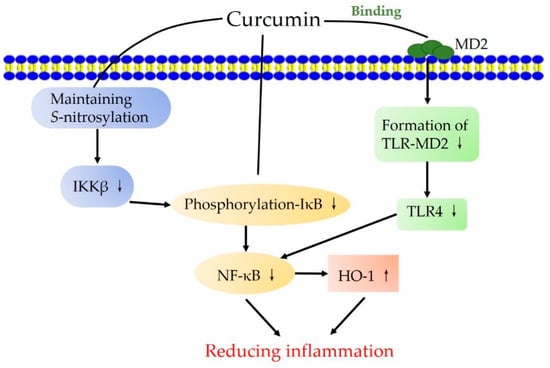 Chronic inflammation is caused by many external or intrinsic factors, and it is considered a key mediator for diseases. Curcumin can not only reduce the oxidative stress, but also protect against inflammation effectively via modulating pro-inflammatory cytokines and related signaling pathways, such as NF-κB, peroxisome proliferator-activated receptor-gamma (PPAR-γ), and myeloid differentiation protein 2-TLR 4 co-receptor (TLR4-MD2) signaling pathways [,,,].