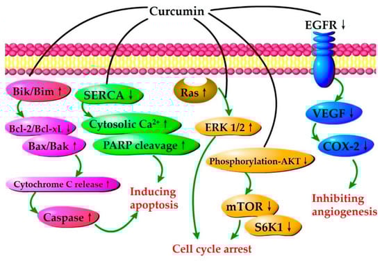 Curcumin-mediated anticancer signaling pathways, associated with the induction of apoptosis and cell cycle arrest, as well as the inhibition of angiogenesis. The up arrows indicate the upregulation, while the down arrows indicate the downregulation. Bcl-2, B-cell lymphoma 2; Bcl-xL, B-cell lymphoma-extra large; Bik, Bcl-2-interacting killer; Bim, Bcl-2 interacting mediator of cell death; Bax, Bcl-2-associated X protein; Bak, Bcl-2 homologous antagonist killer; SERCA, Sarco/endoplasmic reticulum calcium ATPase; PARP, Poly (ADP-ribose) polymerase; Ras, an oncogene product in many human cancers; ERK1/2, Extracellular signal-regulated kinases; Akt, Protein kinase B; mTOR, Mammalian target of rapamycin; S6K1, p70-S6 kinase 1; EGFR, Epidermal growth factor receptor; VEGF, Vascular endothelial growth factor; COX-2, Cyclooxygenase-2.