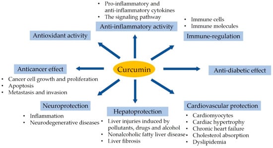 Numerous studies indicate that curcumin exhibits hepatoprotective effects on acute and chronic liver injuries induced by pollutants, drugs, and alcohol, nonalcoholic fatty liver disease, and liver fibrosis [,].