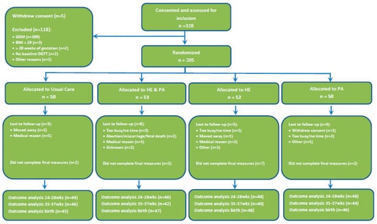 The women were randomized, and were stratified by site to usual care (UC), HE, PA, or HE and PA. The intervention has been described in detail previously [8,10]. After randomization, the women were assigned a lifestyle coach who provided five face-to-face, and up to four telephone coaching sessions, based on the principles of motivational interviewing. The coaches received standardized training and an intervention toolkit (including, e.g., a pedometer in the PA intervention) tailored to their culture/language. The coaching involved the discussion of seven HE and/or five PA “messages”, and a GWG <5 kg was targeted [10]. The HE intervention promoted a food-based, lower simple and complex carbohydrate, lower fat, higher fiber, and higher protein diet, including a focus on portion size, and therefore a more limited intake of total calories. The PA intervention promoted both aerobic and resistance physical activity. At least four face-to-face coaching sessions were expected to take place before the second measurement session (24–28 weeks), and the intervention was completed after 35 weeks of gestation. The HE intervention was associated with the self-reported reduced carbohydrate intake, reduced portion size, increased vegetable intake, and reduced sugary drinks intake, while the PA intervention was associated with a reduced sedentary time and increased moderate or vigorous activity [10]. The combined intervention was the only intervention associated with a significant reduction in GWG.