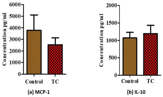 There were no significant differences in serum pro- (MCP-1) vs. anti-inflammatory makers (IL-10) at week 8 (p > 0.05, Figure 2a,b). In the epidydimal fat, mRNA levels of pro-inflammatory IL-6, TNF-α, MCP-1, and IL-1β were significantly reduced in the TC group compared to the control group (Figure 3a–d, p < 0.05). Among the M1 markers, CD11b and iNOS showed significantly decreased (p < 0.05) expression in the TC group (Figure 3e,f). Moreover, Arg-1 M2 marker showed significantly increased expression in the TC group (p < 0.05) (Figure 3g). Egr-2 M2 marker had no difference in the TC group (Figure 3h).