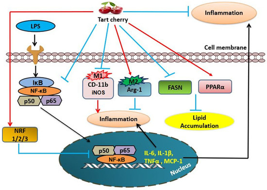 Proposed model for inhibition of adipose tissue inflammation by tart cherry. Tart cherry inhibits the NF-κB pathway and production of Pro-inflammatory markers in adipose tissue, namely CD-11b (M1 macrophage marker), inducible nitric oxide synthase (iNOS) (M1), tumor necrosis factor alpha (TNFα), monocyte chemoattractant protein 1 (MCP-1), interleukin-6 (IL-6), and interleukin-1beta (IL-1β) and increases the production of type-1 arginase (Arg-1) anti-inflammatory M2 marker. Moreover, tart cherry reduces the expression of fatty acid synthase (FASN) and increases the fatty acid beta oxidation (PPARα) and the expression of anti-oxidant markers, nuclear factor erythroid-derived 2-related factor-1 (NRF1), nuclear factor erythroid-derived 2-related factor-2 (NRF2), and nuclear factor erythroid-derived 2-related factor-3 (NRF3), which indirectly inhibit the inflammatory NF-κB pathway in adipose tissue.