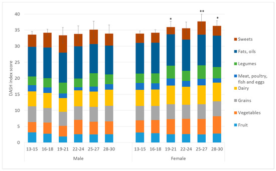 Diet quality (DASH index) by age category and sex for the NDNS Rolling Programme years 1–8. Total DASH scores are out of a maximum of 80 points, with each component score having a maximum of 10 points. Scores were adjusted for ethnicity and survey year. Errors bar indicate a 95% confidence interval of the total DASH score. ** p < 0.01, * p < 0.05 for the difference between the total DASH score for each age category compared to the reference category (age 13–15).