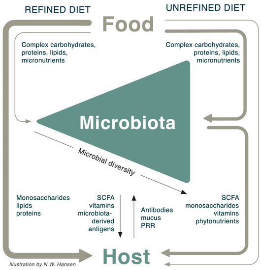 Hansen, N.W.; Sams, A. The Microbiotic Highway to Health—New Perspective on Food Structure, Gut Microbiota, and Host Inflammation. Nutrients 2018, 10, 1590. https://doi.org/10.3390/nu10111590