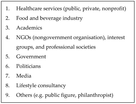 All nominees were categorised into professions based on the listed organisation they represented. One category was further defined and two categories were added to the predefined list of professional groups, resulting in nine categories (see Figure 1). ‘Private industry’ was further defined to ‘Food and beverage industry’, all healthcare professionals were merged into the category of ‘Healthcare services’, and ‘Lifestyle consultancy’ emerged as an additional category as these individuals have private businesses but do not fall under the food and beverage industry, registered healthcare services, nor under media (even though in some cases they do have media presence).