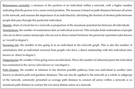 The final datasheet was imported into social network analysis software NodeXL Pro (version 1.0.1.400, Belmont, CA, USA) [24]. Duplicate nominations and self-nominations were deleted. Descriptive statistics and overall network metrics were calculated, including the number of individuals, number of relationships, the graph density, and maximum and average path distances [21,22]. Additional centrality measures were calculated for each individual within the network (see Figure 2 for a comprehensive explanation of each term). We calculated the number of nominations each individual received, the number of direct ties (ingoing and outgoing ties), and the normalised betweenness centrality [17,25].