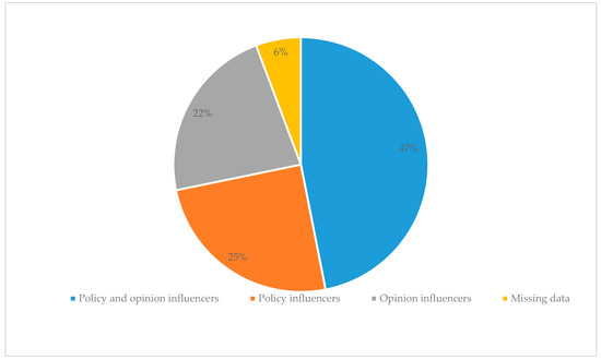 After the removal of duplicate (n = 3) and self- (n = 2) nominations, the survey provided 804 nominations, including 20 nominations for organisations rather than individuals. Just under half of the nominations (47%) were based on the perceived ability of a peer to influence both public policy and public opinion, 25% of the nominated individuals were regarded as policy influencers, and a further 22% as opinion influencers (Figure 3). The number of received nominations per individual ranged from 1 to 40 nominations for the most frequently nominated actor.