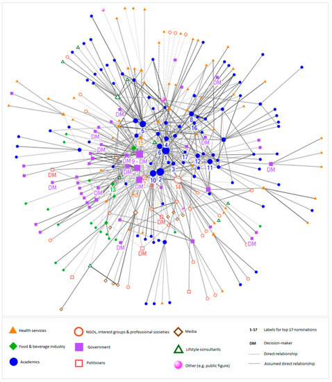 The aim of this study was to identify a network of (influential) actors involved with shaping public opinion and/or public policies on obesity and diabetes in New Zealand, by performing a systematic social network analysis. Through this network analysis, we aimed to (1) assess how key actors are connected, (2) assess which professional categories these key actors represent, (3) assess to what extent these separate categories interact, and (4) identify actors who hold key positions within the network, enabling them to influence public opinion, policy development, and its implementation.