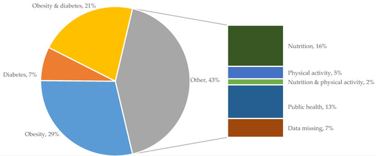Nominated expertise of individuals in the network. The main pie shows the fraction of key actors who were regarded as obesity and/or diabetes specialists. The grey section groups all individuals with an area of expertise that relates to diabetes and obesity, including nutrition, physical activity, and public health.