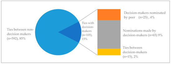 The network entails a total of 697 direct ties, of which 15% are direct ties with decision-makers (n = 105). These direct relationships with decision-makers can be further subdivided into those nominated by a peer (also known as incoming-nomination, n = 25, 4%), nominations of peers by a decision-maker (also known as outgoing-nomination, n = 65, 9%), and relationships between two decision-makers (n = 15, 2%). The share of relationships with decision-makers within the identified network is presented in Figure 6 below.